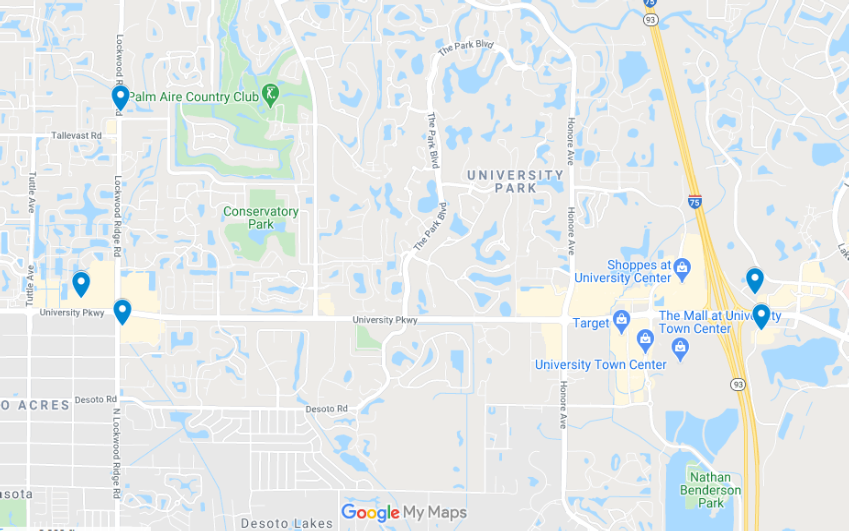 Chain food stores in town are Publics and Winn Dixie I didn’t mark them as they are everywhere